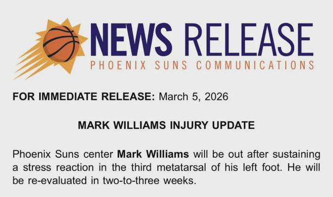 太阳官方宣布:马威左脚第三跖骨出现应力反应(骨骼过度使用损伤的早期阶段),两到三周后重新进行评估。