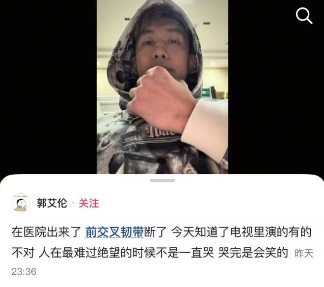 郭艾伦也在个人社交平台回应伤情:“在医院出来了,前交叉韧带断了,今天知道了电视里演的有的不对,人在最难过绝望的时候不是一直哭,哭完是会笑的。”