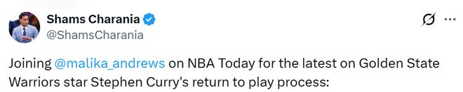 Shams表示,库里恢复稳定向好,如果一切顺利,有望在3月底前回归。他在《NBAToday》节目中说道:“目前外界持谨慎乐观态度,斯蒂芬-库里有望在本月某个时候重返阵容。据我了解,他周二下午(当地时间)在波士顿进行了一次效果很好的场上训练,开始奔跑、变向、移动,甚至进行轻微对抗,有点变回我们熟悉的那个库里了。”