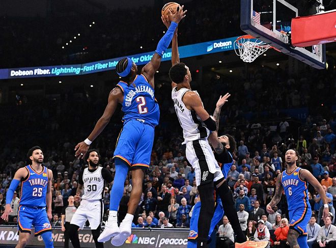 雷霆队和马刺队早早锁定季后赛门票,双雄争霸大局已定,后面的球队完全追不上。雷霆队前往客场挑战76人队,杰伦威和多特复出,冠军五虎将正式合体。雷霆队首节领先10分,半场领先22分。即便76人队在第三节疯狂反扑,可雷霆队还是牢牢掌控着20分左右的领先优势,比赛早早失去悬念。最终雷霆队以123-103大胜76人队。此役过后,雷霆队豪取12连胜,57胜15负高居西部第1位。马刺队前往客场挑战热火队,文班亚马统治禁区,马刺队篮板球62-38完爆热火队,轻轻松松制造一场25分惨案。此役过后,马刺队取得6连胜,54胜18负排在西部第2位,依然落后雷霆队3个胜场。