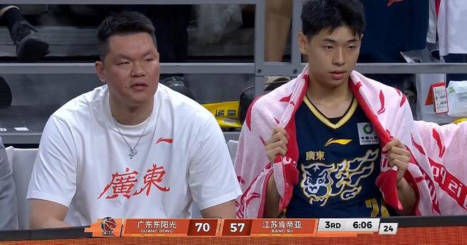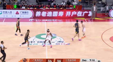 第三节陈家政再获先发机会领防庞峥麟,开局张皓嘉再丢空位三分,庞峥麟萨姆纳突破各造2罚,江苏升级了对萨姆纳的身体对抗强度,广东阵地战有些打不开,江苏也是同样。