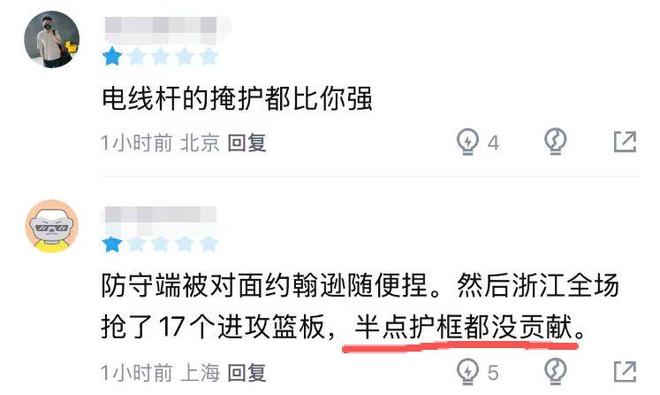 本场比赛,北京队的篮板以33-41输给浙江,且让浙江队足足抢了17个进攻篮板,而北京队只有6个。面对浙江的大外援约翰逊,周琦可以说是毫无应对之策,最后四分钟,周琦在场上不卡位不抢篮板,防守甚至连手都不伸一下,可以说将“篮球公务员”的属性体现地淋漓尽致。