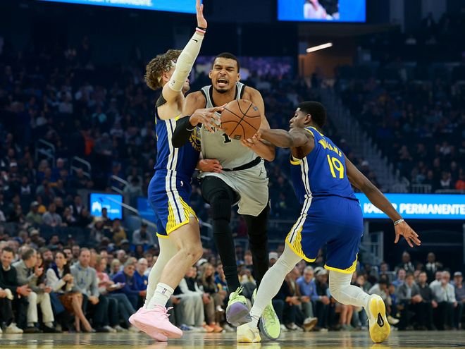 中场休息回来,马刺进攻火力下滑本场首次单节不足30分,勇士率先反扑追分,文班亚马三分命中维持18分优势。马刺团队攻势继续维持84-63领先21分优势,勇士也是顽强反扑追分,双方第三节均是命中4记三分。文班亚马单节3中2再得7分,勇士借助多点开花攻势缩小差距,马刺单节26-34被追回8分,三节结束马刺96-83领先勇士。前三节比赛,马刺三分30中9,文班亚马17中13得到34+14+2帽引领4人得分上双;勇士三分28中9,全队5人得分上双,但没有人达到15分。