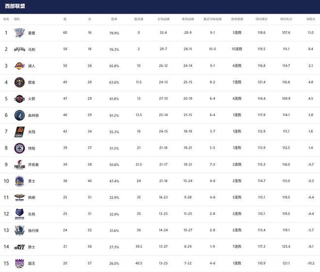 1-2名:雷霆(60胜16负)、马刺(58胜18负)