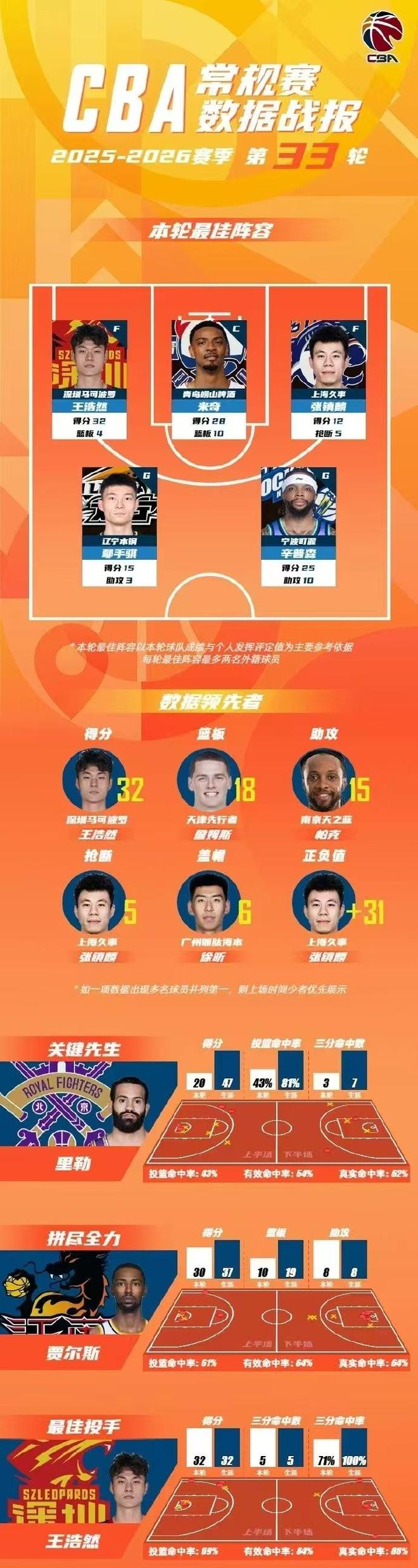 CBA官宣常规赛第33轮最佳阵容,深圳21岁新星王浩然大爆发,狂轰32+5三分创生涯纪录,率领深圳大胜卫冕冠军广厦豪取8连胜入选,此外米奇、张镇麟、鄢手骐与辛普森也入选。
