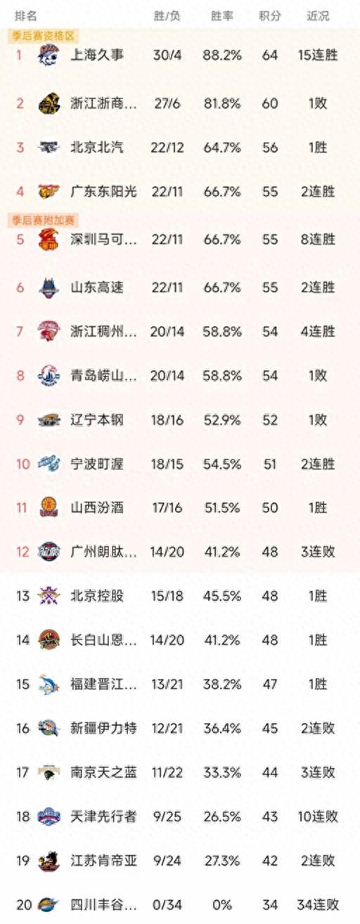 CBA最新积分榜
