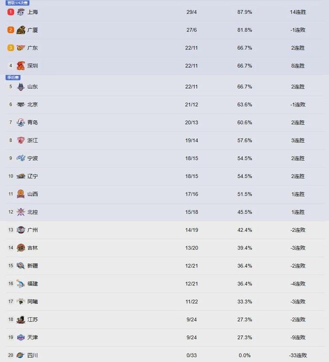 另外,排名靠后的南京、江苏、天津、四川基本上提前无缘季后赛了。四川33连败,这纪录还在继续刷新,有点离谱。而北控、广州、吉林这三支球队在季后赛附加赛门槛线位置疯狂较劲,谁最后能进都不好说。总是,这赛季上海和深圳成为了第一档夺冠大热,他们的出色表现远远要强于北京和广东等球队。