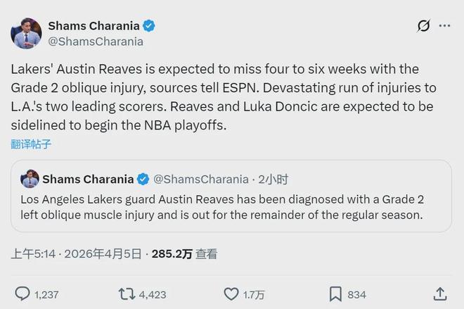 北京时间4月5日凌晨,据NBA名记Shams报道,湖人后卫奥斯汀-里夫斯因二级腹斜肌拉伤,将缺席4到6周。里夫斯跟东契奇一样,不仅常规赛报销,也将缺席季后赛首轮。本赛季东契奇和里夫斯场均合砍57分,占全队得分48.9%。