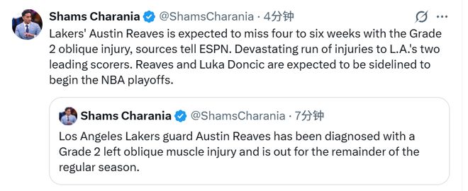 北京时间4月5日,湖人刚遭遇东契奇左腿筋拉伤、无限期缺阵的打击,湖人主帅雷迪克又在今日表示,里夫斯对左侧腹斜肌/肋部区域进行了核磁共振检查。随后,坏消息再次传来,里夫斯被确诊为左侧腹斜肌二级拉伤,将缺席本赛季剩余常规赛。Shams表示,里夫斯预计将缺阵4至6周。湖人两大核心得分手接连遭遇重伤,形势极为严峻。里夫斯与东契奇均大概率将缺席NBA季后赛首轮赛事。