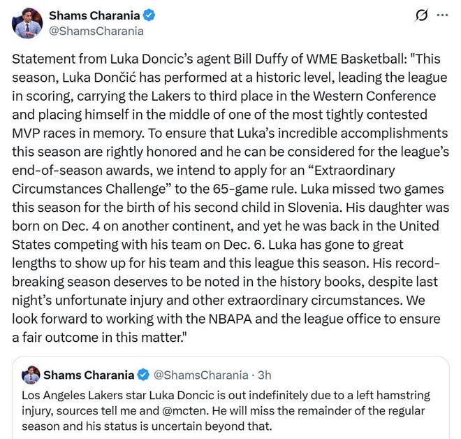 面对这样的情况,东契奇经纪人比尔-达菲火速发布声明,将对65场规则提出“特殊情况挑战”,因为东契奇此前曾因为陪产假缺席了2场比赛。