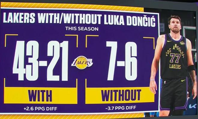 本赛季东契奇出战时湖人队战绩为43胜21负,缺席期间战绩仅为7胜6负,直观展现出东契奇对于湖人队巨大的影响。