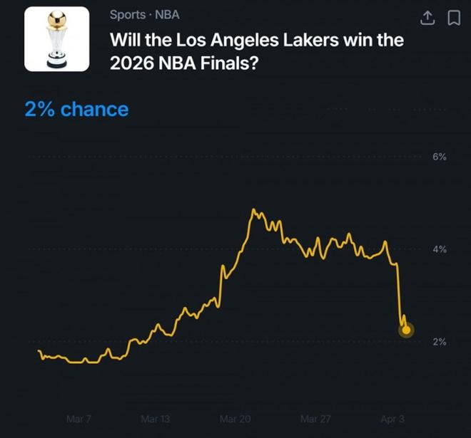 在东契奇确定二级拉伤后,湖人队夺冠概率也迅速暴跌至2%。