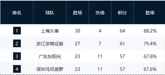 上海久事凭借本轮对手广厦失利,将领先优势扩大至三个胜场,稳居积分榜榜首,提前锁定季后赛门票已无悬念。球队整体节奏稳定,攻防体系日趋成熟,成为本赛季最具统治力的争冠热门。