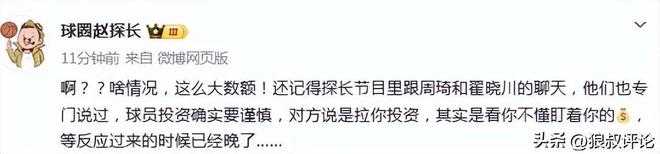 啥情况,这么大数额!还记得探长节目里跟周琦和翟晓川的聊天,他们也专门说过,球员投资确实要谨慎,对方说是拉你投资,其实是看你不懂盯着你的钱,等反应过来的时候已经晚了。