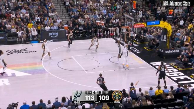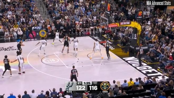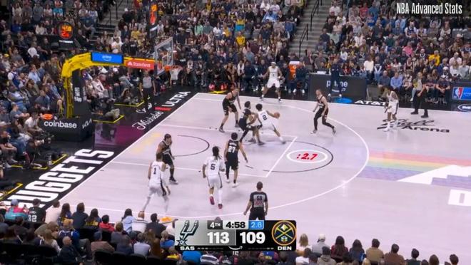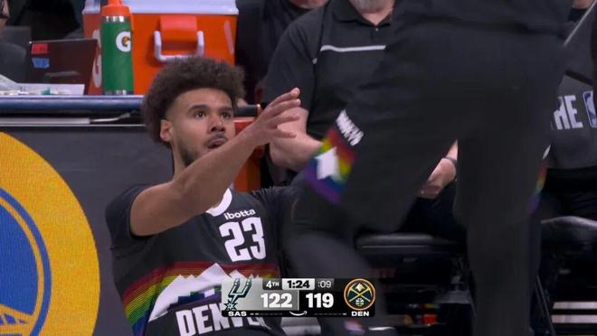 ——第四节剩下1分24秒前,掘金116-122落后马刺6分,卡梅伦约翰逊接约基奇传球,投进三分并且造成福克斯犯规。
