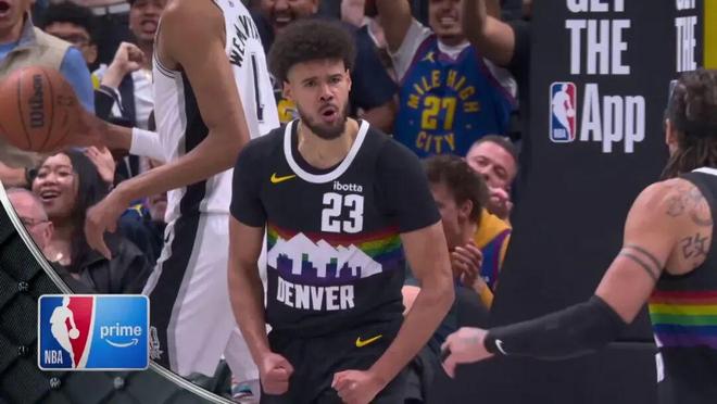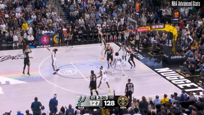 ——加时赛剩下2分18秒前,掘金128-127领先1分,还是卡梅伦约翰逊,接戈登的传球,投进了一记三分,将分差从一个回合变成两个回合。