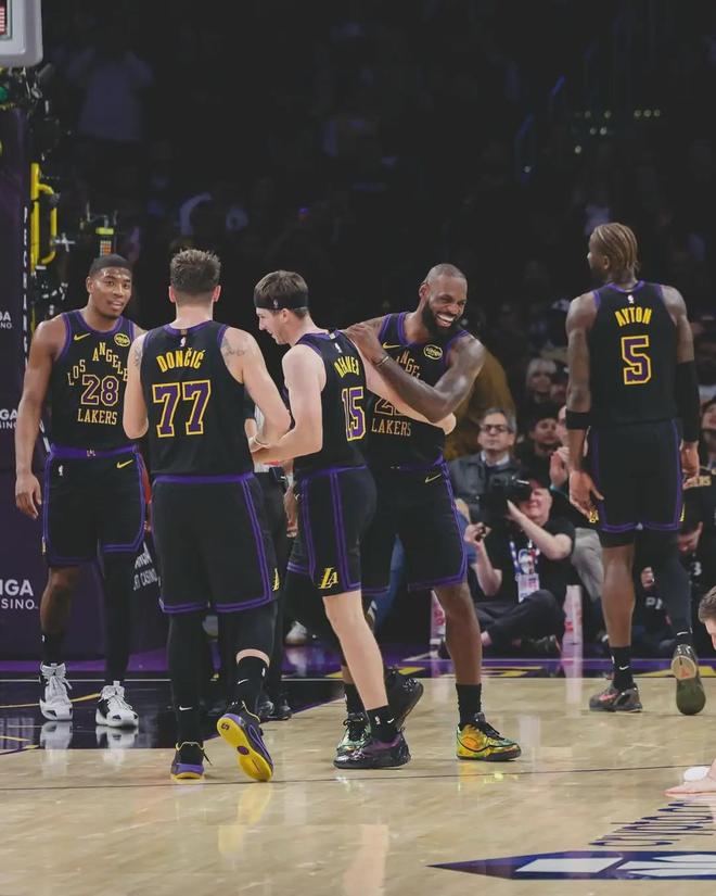 以场均得分排序,湖人本赛季的核心七人分别是:东契奇、里夫斯、詹姆斯、艾顿、八村垒、斯玛特、肯纳德。