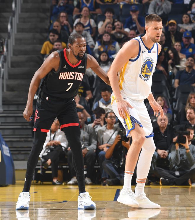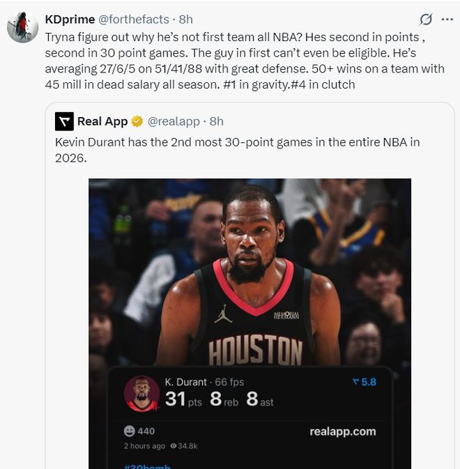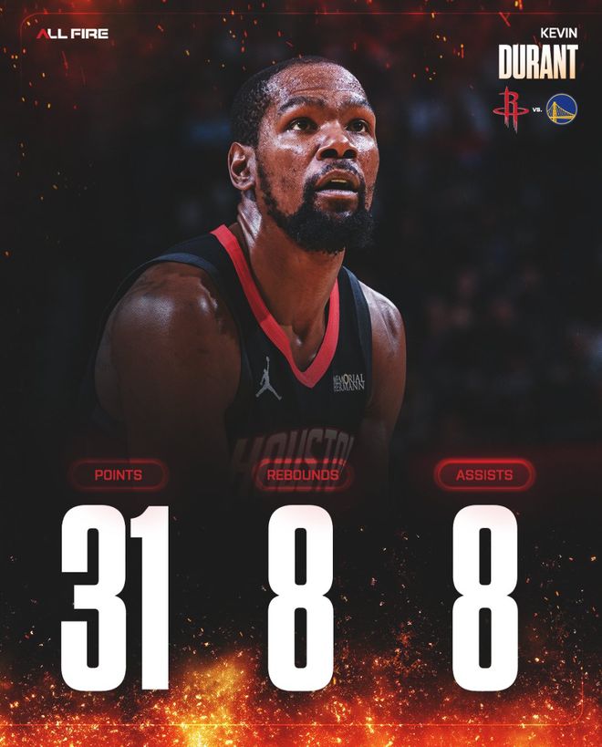杜兰特不仅带领火箭稳居西部季后赛的席位,他还场均27分6篮板5助攻,命中率51%,三分命中率41%,罚球命中率88%,防守端也非常出色。