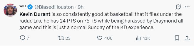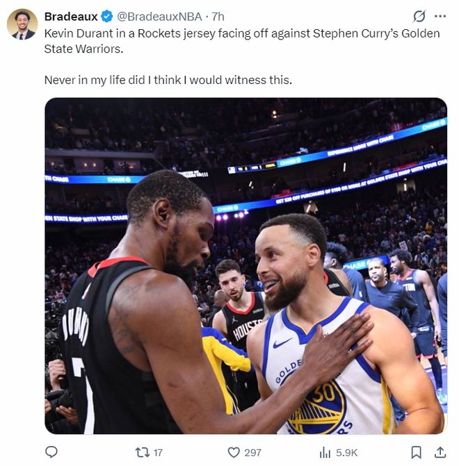 休媒Bradeaux写道:从未想过有一天杜兰特穿上火箭球衣与斯蒂芬-库里竞争。这场比赛后杜兰特已经拿到第28次30+,这是他最近10个赛季最多的一次,也就是37岁的他比肩了27岁的他。