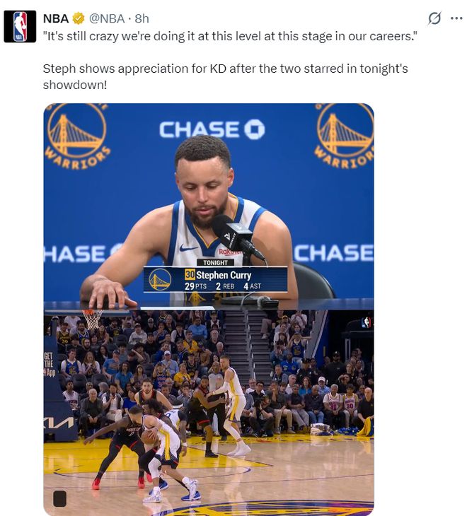 库里在赛后也盛赞了杜兰特保持了超高的竞技状态,很高兴我们在生涯的这个阶段还能有这样的水准,这实在是太疯狂了。