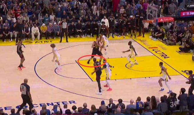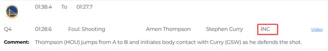 第一次漏判发生在距离比赛结束还剩1分28秒时,报告指出,火箭球员阿门-汤普森在防守库里投篮时,从A点移动到B点并主动与库里发生身体接触。这是一次漏吹的防守犯规,库里当时上篮命中,本该吹罚2+1,裁判没有响哨,库里少了一次罚球机会。这次漏判是勇士吃亏,火箭获利。