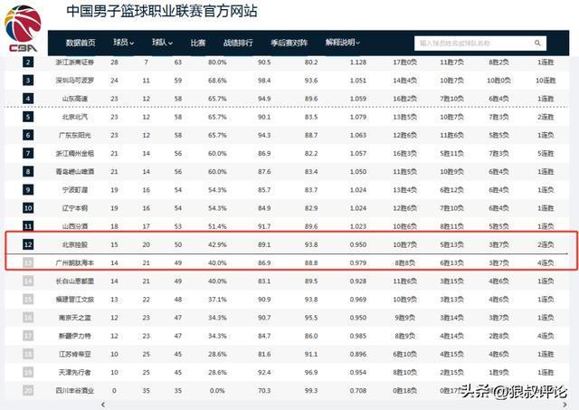 过去4场比赛,北控输了3场,总战绩为15胜20负,排在积分榜第12位,并没有把握住广州这一波连败锁定季后赛名额。