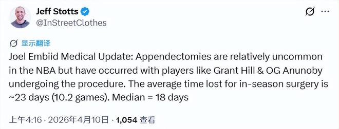 伤病专家斯托茨表示,阑尾切除手术在NBA中相对少见,但也曾有球员经历过,比如格兰特-希尔、OG-阿奴诺比都接受过该手术。赛季中进行此类手术的球员,平均缺阵约23天(对应10.2场比赛),中位缺阵时间为18天。
